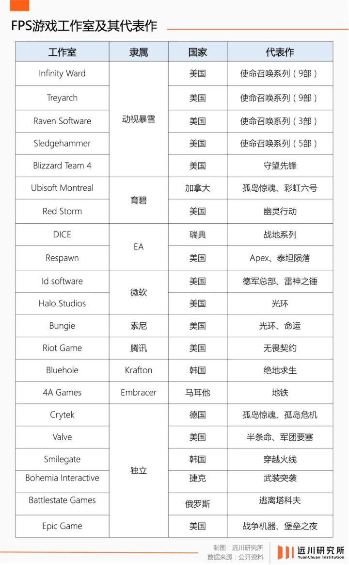 仅在《使命召唤》这一IP之下,动视就先后布局了四个工作室轮流担纲开发。另外,打造《战地》系列EA DICE、做出《孤岛危机》的Crytek、拥有《反恐精英》厂牌的Valve、缔造《光环》的Bungie、以及凭借《绝地求生》席卷全球的韩国Bluehole(蓝洞),都拥有雄厚的游戏工业实力。