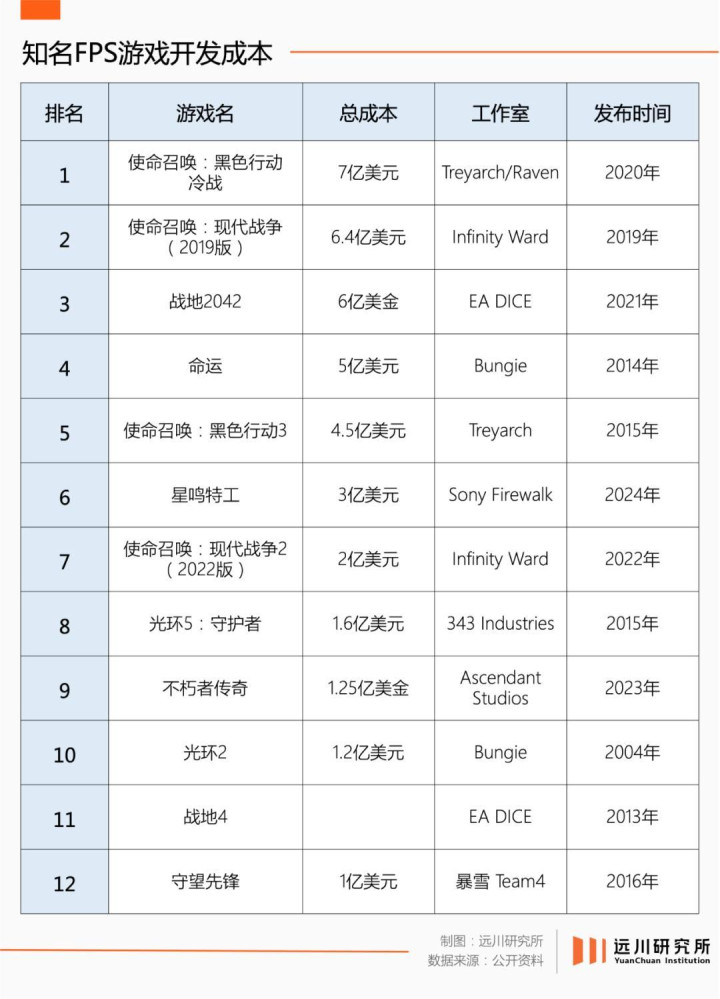 过去二十多年,大型端游的制作门槛提高了十倍,射击游戏的更迭尤其快。2003年初代《使命召唤》只花了450万美元,2009年《现代战争2》来到了5000万美元;2020年《黑色行动:冷战》达到令人咋舌的7亿美元。而全球制作费用最高的12款射击游戏,平均成本(开发+营销)达到了3.4亿美元。
