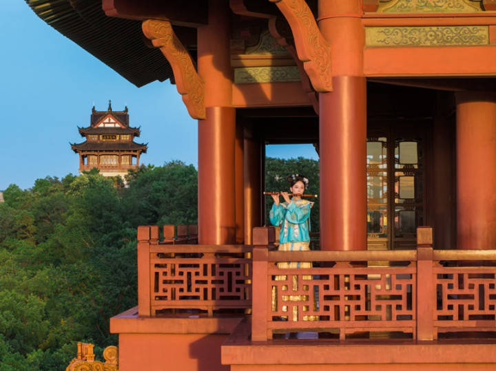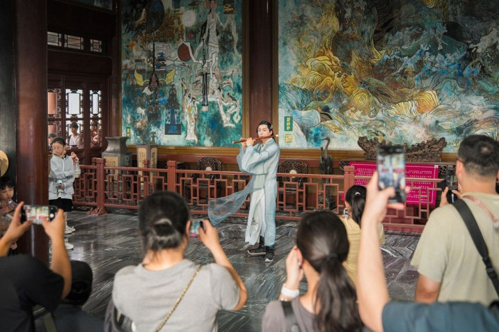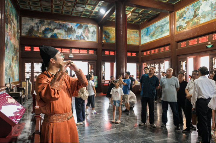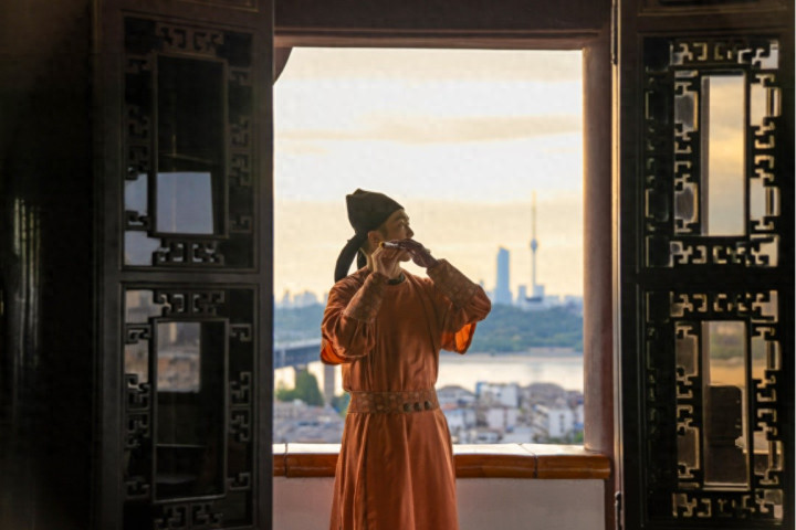 游客在登楼游览过程中不再是单纯“看楼”,而是化身“入诗入画” 的参与者,从而收获一段美妙游览体验。一楼大厅里,当身着素雅襦裙的乐师静立于《黄鹤归来》壁画前,玉笛横吹,清亮笛音穿透古朴空间,瞬间将游客拉入诗句描绘的诗意氛围;三楼凭栏处,身着青色长衫的乐师在雕花窗畔演奏,时而婉转,时而悠扬,聆听中既能感受“极目楚天舒”的豪迈;登至五楼,穹顶之下的笛音与远处龟山电视塔、长江大桥的景致相融,让游客在偶遇笛音的同时尽享黄鹤楼的壮美风光与文化诗意。