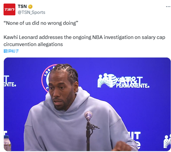 被问到拿球却不提供任何服务,莱昂纳德表示这不准确,还表示:NBA会做好他们的工作,我们没有做错任何事。就这样。我们欢迎这次调查,这不会对我或球队的其他成员造成干扰。