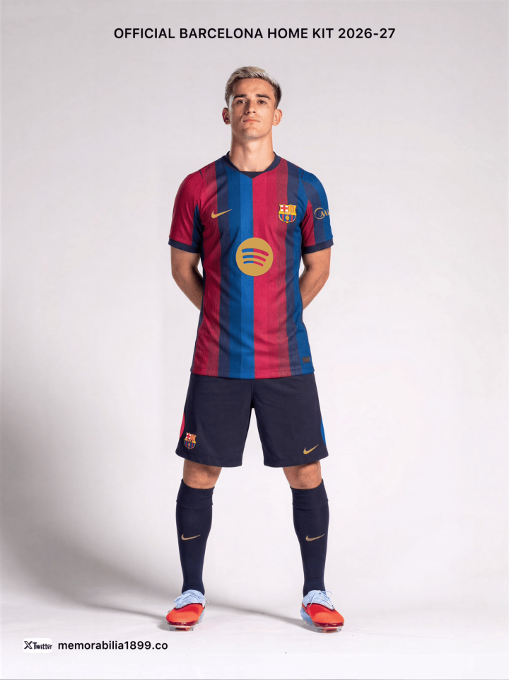 虎扑04月08日讯据推特账号memorabilia1899消息,巴萨2026/27赛季主场球衣的设计细节进一步曝光。在此前与科比联名球衣概念图流出后,本次展示的是更接近最终版本的主场方案。