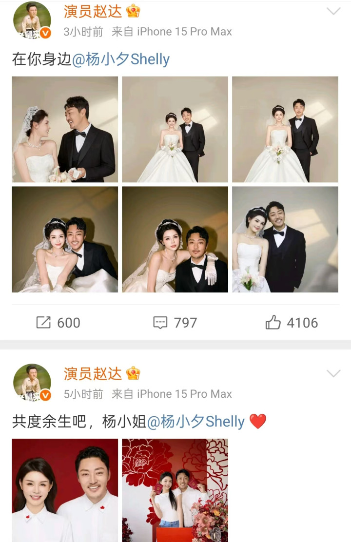 或许是人到中年突然步入婚姻很激动,赵达连发两条动态表达自己的喜悦,而且是多平台发布,生怕别人不知道自己结婚了。