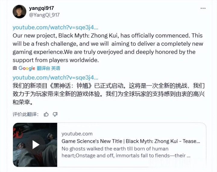 游戏科学联合创始人杨奇随后在社交媒体发长文表达感谢。他写道:“新项目《黑神话:钟馗》已正式启动。这将是一次全新的挑战,我们也一定会努力带来不一样的体验。真心感谢全世界玩家的支持,我们感到特别荣幸。”
