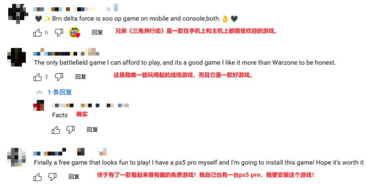 登陆主机端首日,《三角洲行动》就快速引爆了多个海外游戏社区。在官方发布的主机端视频下,你能看到大量海外用户都对此表示期待,其中更有未曾接触过《三角洲行动》的玩家留言:“从它的品质来看,我一开始还以为这款游戏不是免费的。”