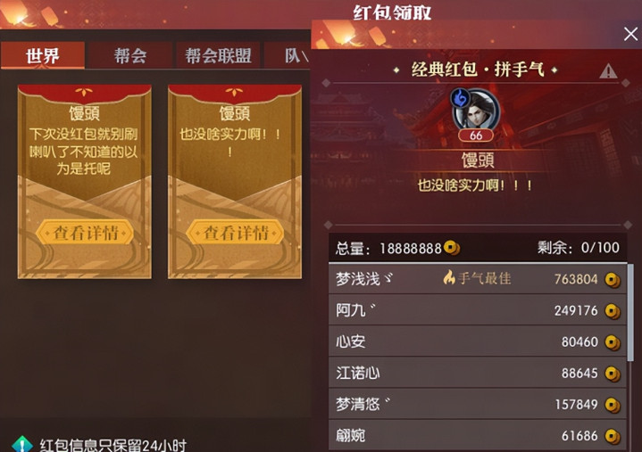 有玩家总结,馒頭虽然游戏时间并不久,但是消费能力已经是千万级的。他不仅是服务器中战力最顶级的存在,也是最早做出百万人民币坐骑的豪强,而且他对于自己的财力丝毫没有隐藏的迹象,不仅动不动就在主城发放数千元红包,还对想要试乘坐骑的玩家有求必应,简直成为龙湖服的“打卡点”。