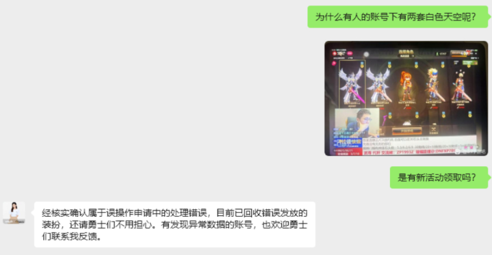 而其实这名玩家却并不是通过bug卡出来的绝版天三,而是官方客服直接发的啊。也就是说官方总共发了两套绝版天三给这名玩家,原来这名玩家之前提交了装扮误开启申诉。表示自己的绝版天三开错了角色,于是找到客服申诉找回。结果客服发了一套新的绝版天三给这名玩家,而原来已经开启了的天三却并没有回收,所以这名玩家才能拥有两套绝版天三。