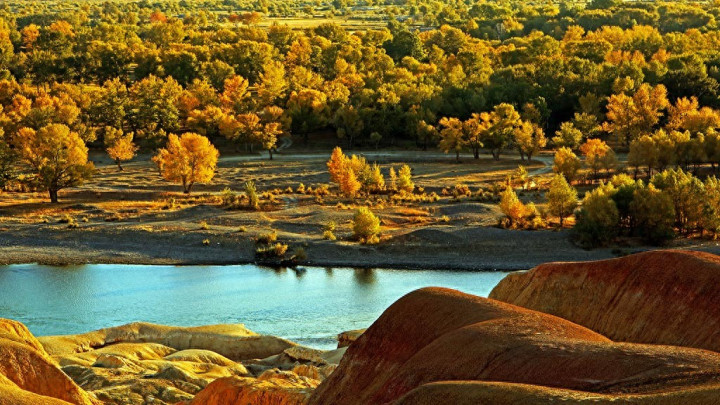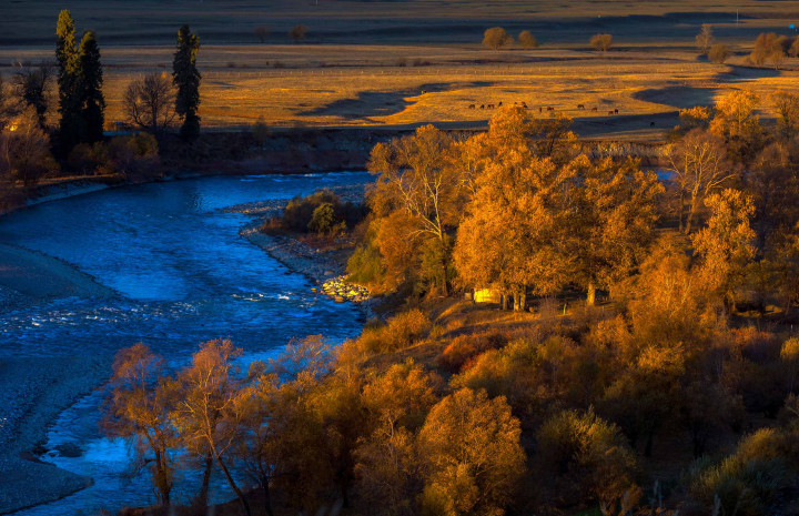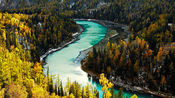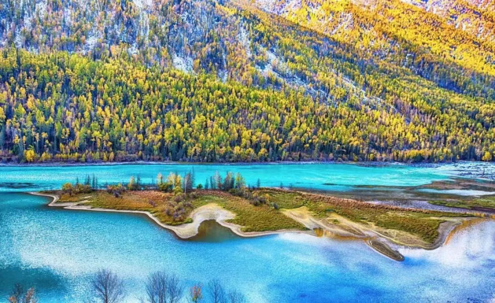 每年九月下旬至十月初,阿勒泰便进入了一年当中最美的季节。金黄的白桦林,碧蓝的湖水,巍峨的雪山和绿色的雪松交织在一起,构成一幅动人的画面