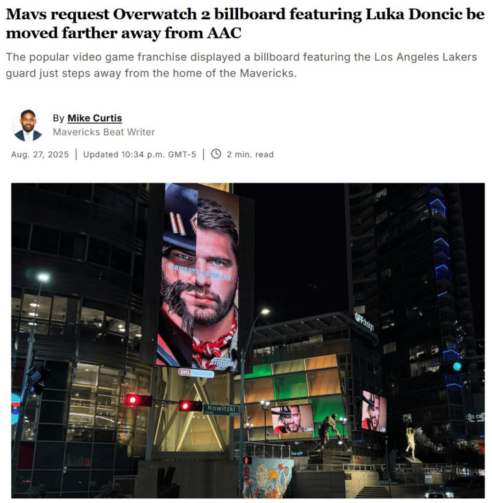 北京时间8月30日,距离新赛季NBA常规赛开战还有不到两个月的时间。近日,据美媒报道称,湖人队球星东契奇代言游戏《守望先锋》的广告牌出现在了离独行侠主场不远的地方。对此,独行侠主场要求将广告牌撤离。