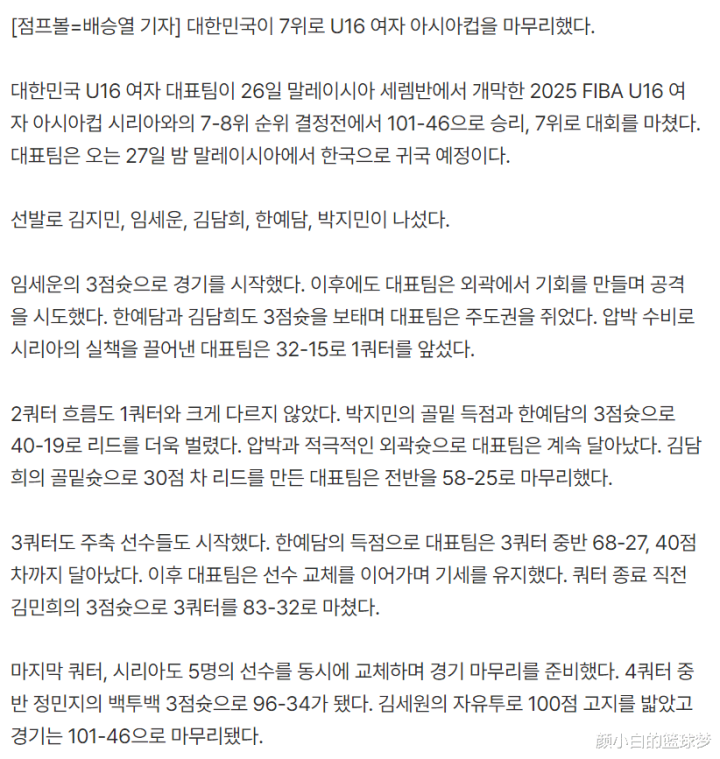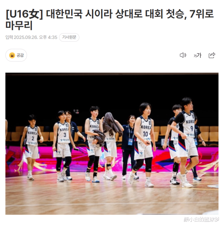 赛后韩国媒体《跳球》写道:韩国U16女篮终于在亚洲杯上拿到首胜,她们最终以1胜3负大赛第七名结束了征程。