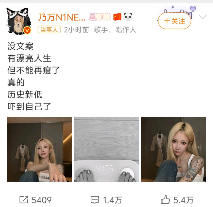 乃万发文称自己暴瘦,近期体重已经是历史新低,已经是不能再瘦下去了,还吓到自己了,顺便晒了几张图片。