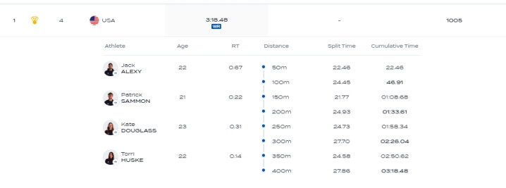 美国队在决赛派出杰克·亚力克西、帕特里克·萨蒙、凯特·道格拉斯与托丽·赫斯克出战,最终以3分18秒48打破世界纪录夺冠。个人中立运动员队获得亚军,法国队获得季军。