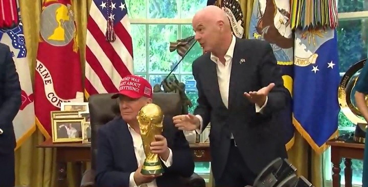 因凡蒂诺拿着大力神杯对特朗普说道:“这个奖杯只属于赢家,你是胜者,当然你可以摸摸它。这很重,上一位捧起这座奖杯的人是梅西,现在奖杯就在这里。”