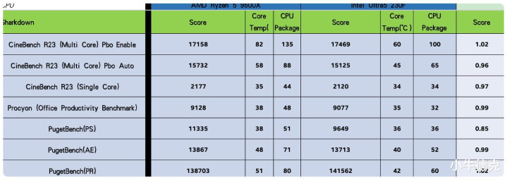 在这几款软件的跑分数据上,230F和9600X互有胜负,但差距不大。不过一转到温度和功耗环节,230F的优势一下就被放大了,可以说呈现了碾压之势。230F6个性能核和4个能效核的优势,在此刻被放大了。