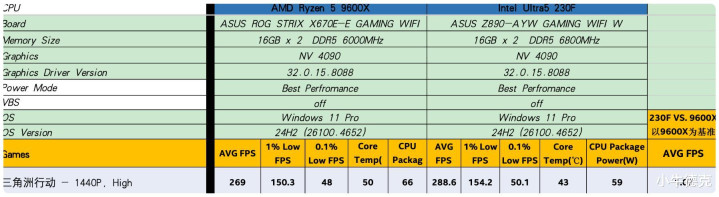 那么,到这里,关于玩《三角洲行动》哪款处理器更合适的结论已经呼之欲出了,稍稍领先的帧率表现,大幅领先的温度和功耗表现,不是9600X不够游戏,而是230F的光芒太过耀眼。