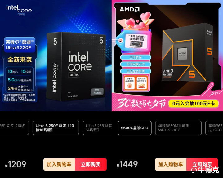同一时间,都是官方自营店的情况下,230F的价格是1209元,AMD 9600X的价格是1449元。