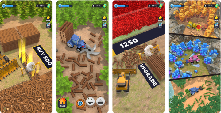 其中,《Lumber Chopper》玩法上是一款比较偏超休闲的游戏,游戏中,玩家前期需要驾驶伐木机砍树,然后吸取树木放置到指定区域,中后期则可以建造锯木厂等生产建筑或雇佣工人等强化游戏爽感。中后期建造、经营等玩法的加入,让这款产品从轻度迈向了中度,也为其混变的商业模式奠定了基础。