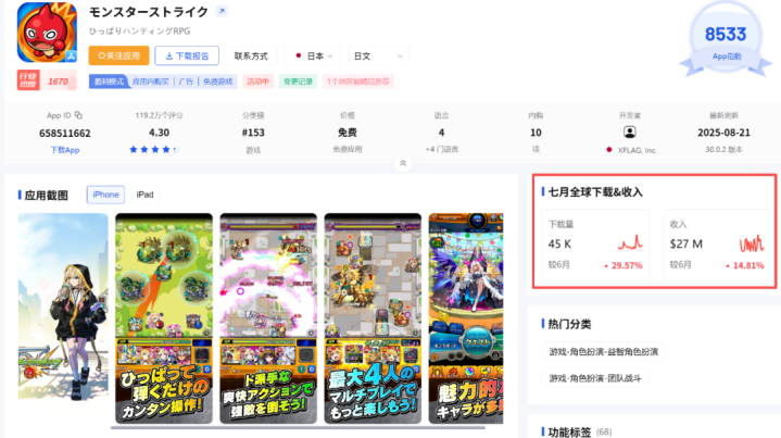 除《崩坏:星穹铁道》这款出海产品外,其它几款均为日本知名IP产品,比如《Dragon Ball Z:Dokkan Battle》,作为一款2015年上线的龙珠IP游戏,《Dragon Ball Z:Dokkan Battle》在7月推出了周年庆活动并实现收入暴涨。同样是IP游戏,《怪物弹珠》上线的时间还要早于《Dragon Ball Z:Dokkan Battle》两年。7月,在200连抽、新副本挑战等活动的带领以及最多4人游戏模式(增加了许多仅限多人的稀有任务)、电视广告宣传等多方加持下下,《怪物弹珠》的下载量和收入分别同比增长了29.57%和14.81%,据其官方数据显示,《怪物弹珠》的日本用户已经突破了5000万人。