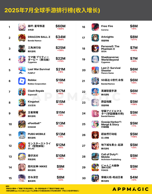 收入榜方面,增长表现比较好的几款产品有《Dragon Ball Z》《崩坏:星穹铁道》《赛马娘》《怪物弹珠》。其中,在新版本新活动的带动下,《崩坏:星穹铁道》7月全球收入环比翻了4倍,排名上升29名达到TOP9。