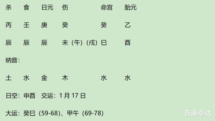 此年,大运甲偏财生丙杀,流年癸伤制小限丙杀;大运午合未,流年酉合命宫巳,小限子合年支辰。